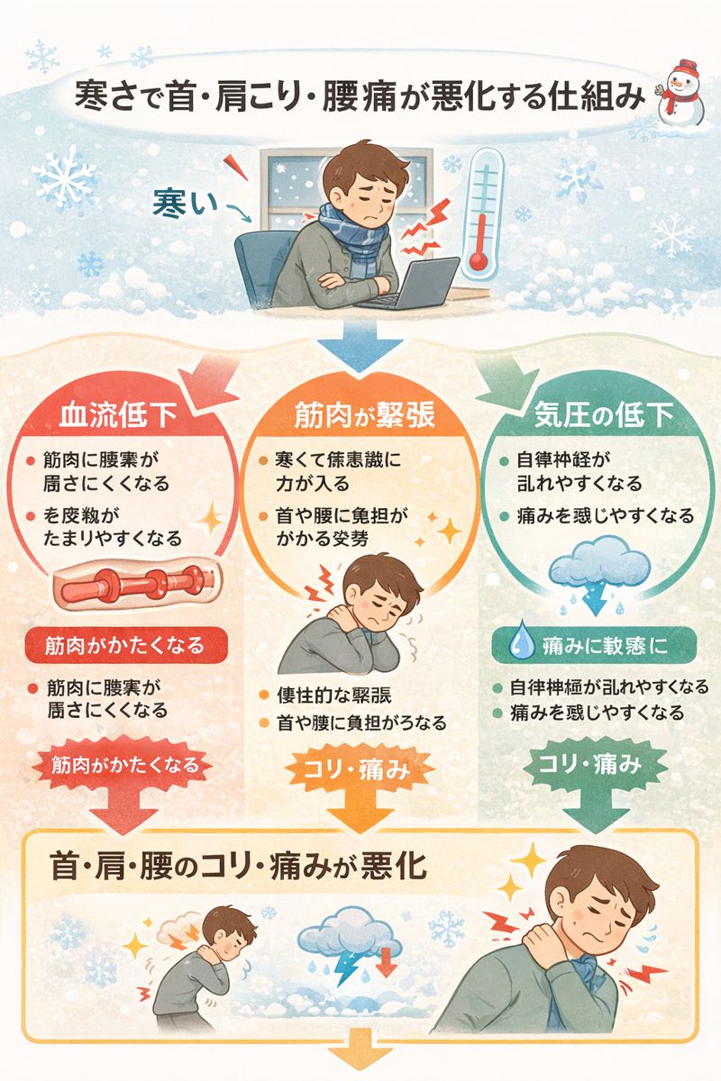 寒さは血流低下と筋緊張を引き起こし、首・肩こり・腰痛を悪化させる